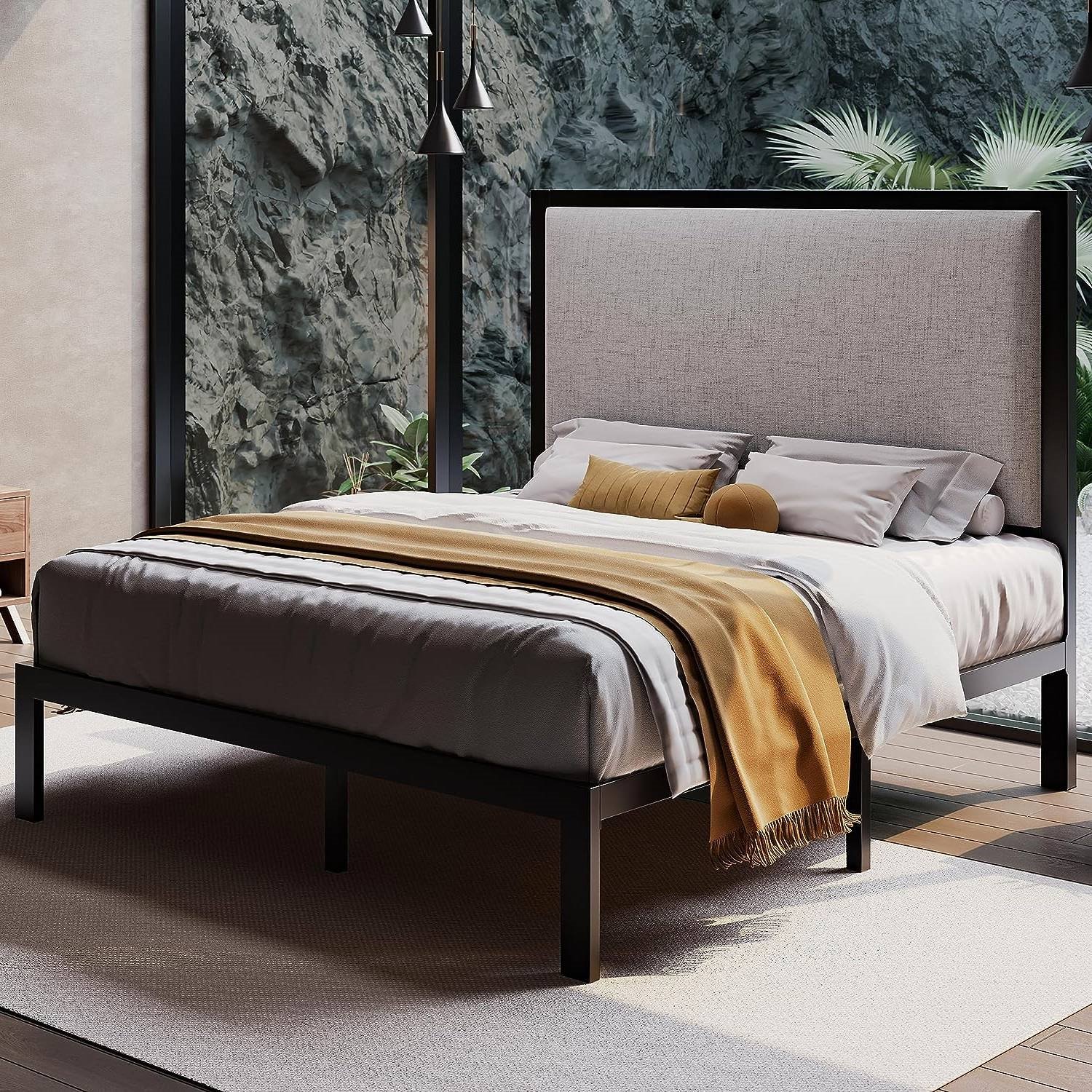 This Queen Black Metal Platform Bed Frame with Tall Grey Linen Upholstered Headboard features uniquely ultra-high 47'' padded headboard, which is the highest on the brand. Made with materials that are both comfortable and skin-friendly, incorporating resilient foam. With a 12'' under-bed storage space, Queen size bed frame with headboard provides additional room to help tidy up your belongings and keep your room neat and organized. Queen size bed uses high-quality wooden slats provide stability and prolong your mattress's lifespan by protecting it from wear and tear. Additionally, ensure that stays securely in place and doesn't slide. High weight capacity of up to 800 pounds, full bed stands strong, providing unwavering support for both kids and adults without noise. Designed for convenience, bed frame Queen with each part labeled can be assembled in less than 30 minutes with clear instructions provided.