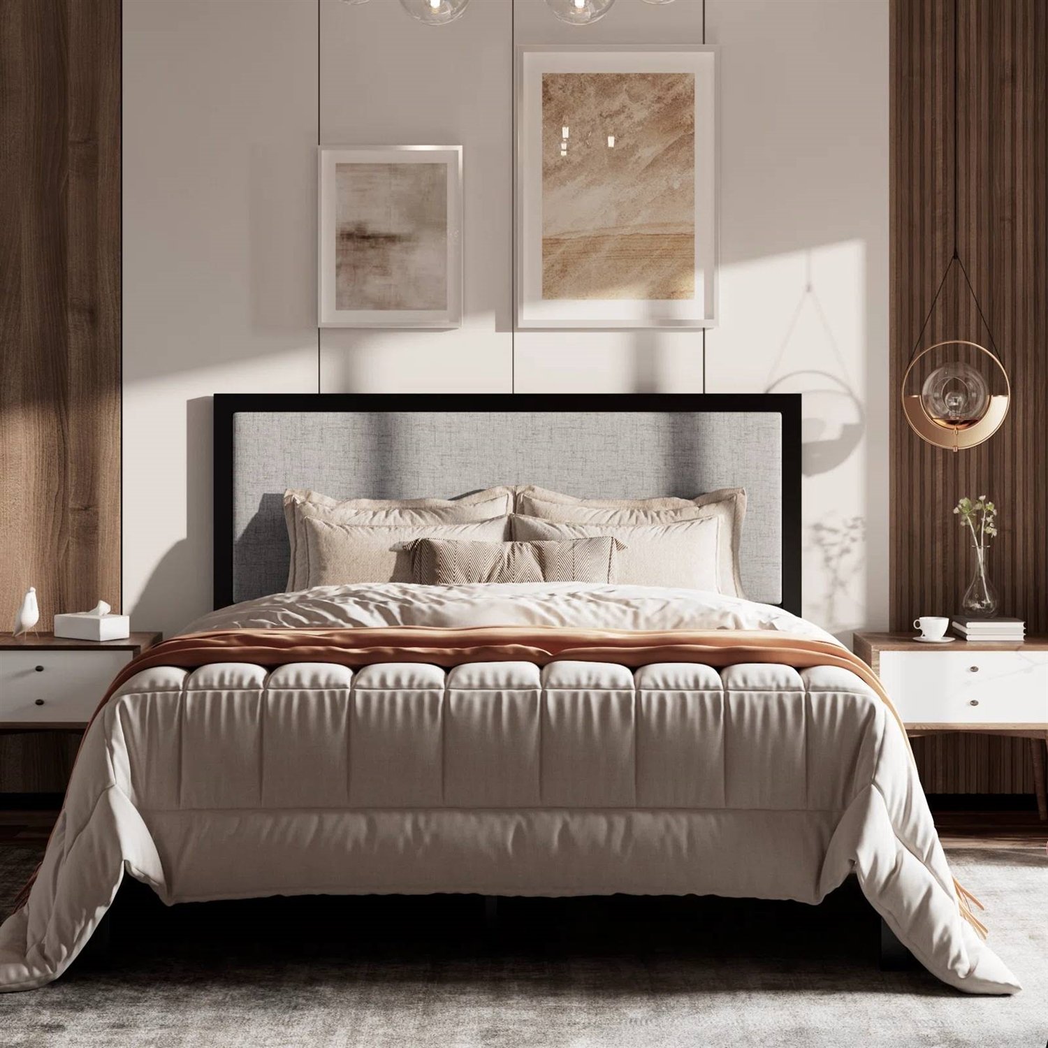 • Queen Black Metal Platform Bed Frame with Tall Grey Linen Upholstered Headboard