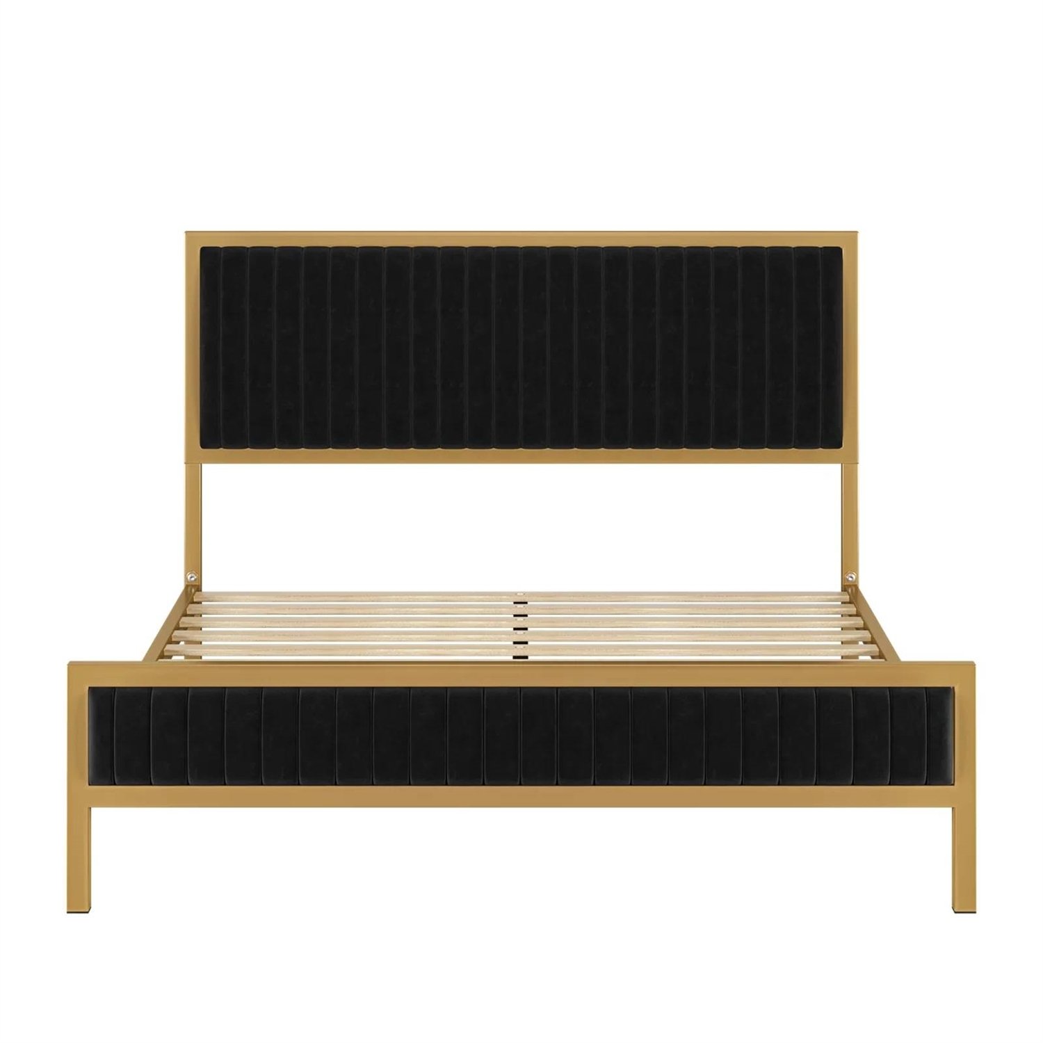 • Queen size Gold Metal Platform Bed Frame with Black Velvet Upholstered Headboard