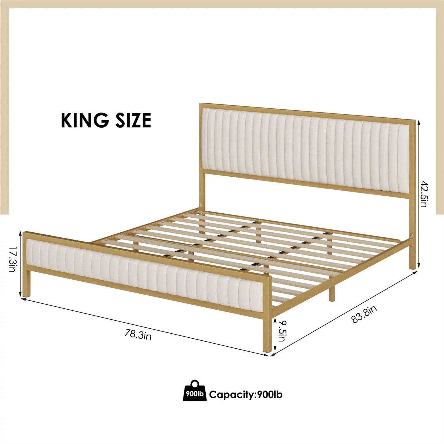 The headboard and footboard of this King size Gold Metal Platform Bed Frame with Beige White Upholstered Headboard are designed with minimalistic yet classic vertical channel tufting and filled with high-quality sponge for exceptional coziness. A premium golden lacquered metal frame, seamlessly combined with luxurious velvet fabric, gives your bedroom a regal ambiance. No matter if your style is modern or vintage, it is the perfect choice to decorate your room. The platform bed features a heavy-duty steel frame and 11 thickened solid wood slats firmly attached with metal screws that can support up to 1000 lbs, making it more comfortable and supportive for your mattress without a box spring, thus saving your money. Provide a reliable foundation for a good night's sleep (recommended mattress: 8"ñ14"). Extra-special silent strips are thoughtfully designed to reduce noise and strange squeaks between the slats and the bed frame. Plus, the soft padding under each metal leg effectively prevents your floor from being scratched and absorbs sound. This modern bed frame will bring you a quiet night. The bottom of the bed frame is 9.5î from the floor, so you can store some boxes, clothes, or shoes to keep your bedroom clean and tidy. The queen bed frame comes in a box that includes instructions and necessary tools, all pieces are labeled. Follow the clear instructions to assemble this beds within 20 minutes.