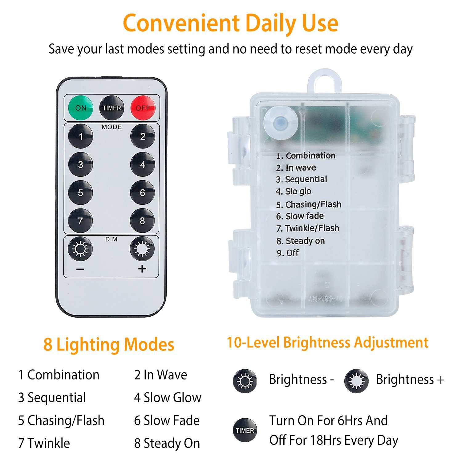 8 Lighting Modes: Combination, In Wave, Sequential, Slow-glo, Chasing/Flash, Slow Fade, Twinkle and Steady On